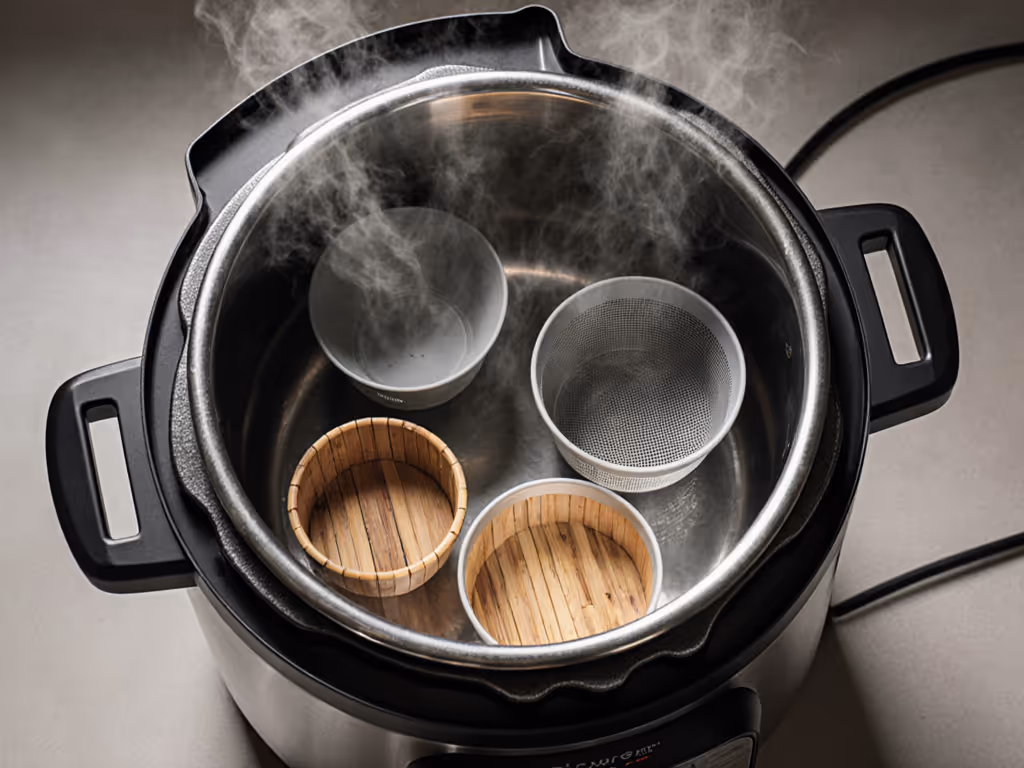 These mimic traditional bamboo steamers but with metal construction. During my Sunday prep, I use them to cook eggs (bottom) and potatoes (top) simultaneously for potato salad. Caution: Clean crevices thoroughly, trapped starch causes "BURN" errors on repeat use. For preventive care and longer appliance life, follow our pressure cooker maintenance guide.